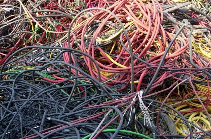 Blandet kabelaffald bestående af forskellige typer kabler og wire.